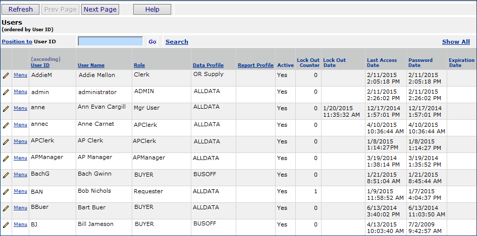 Some sites may wish to give a vendor's users access to the vendor's purchase orders in their supply chain data. If you are the administrator responsible for this task, the steps are similar to setting up any other user, except that a Vendor Security Code must be created and included in the vendor record. The Vendor Security Code is also specified on the data profile assigned to the vendor's users. A new role (VendorAccess) is also available. Instructions for this setup situation are in a separate topic: Setting Up Vendor Access to Supply Chain. However, we recommend that you read the information below to get the "big picture" of user setup and to understand the different terms.