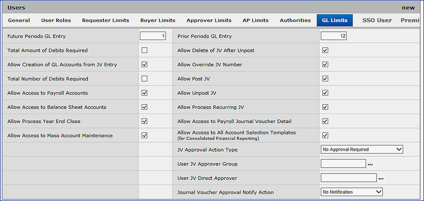 For any user, certain functions -- such as working with patient information, approving requisitions, and posting journal vouchers to the General Ledger -- need authorizations set in the user's profile. User authorization settings, limits, and similar types of user profile information are in this section as well.