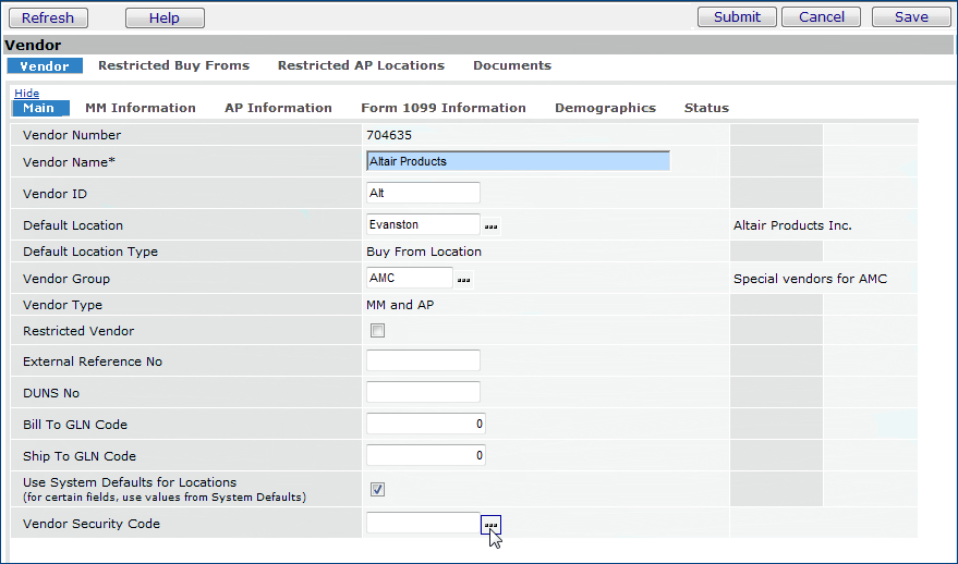 - Click the prompt next to the Vendor Security Code field and select the appropriate code. (You created this code in the previous step.)