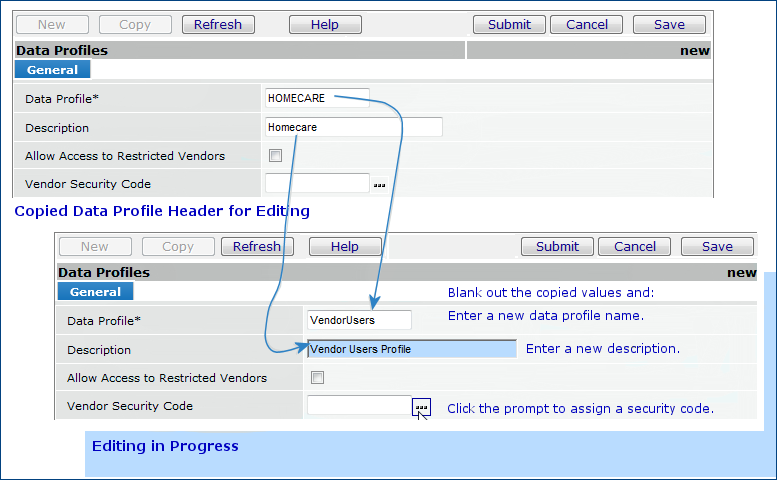 - Locate a data profile that is close to the type of profile that is appropriate for the vendor's users. (You can edit the profile  once it is copied.)
