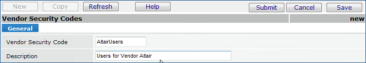 Figure 2 - Vendor Security Codes Edit Panel