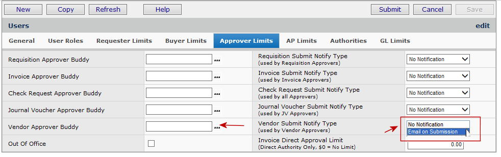 | 4. Select approval notification options for a user who creates vendors or updates Check Names. | Administration > Administration > Users > edit user > AP Limits tab |