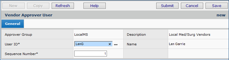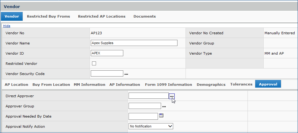 When you create a new vendor, the Approval tab contains fields that default to approvers or approver groups assigned on your User Profile.