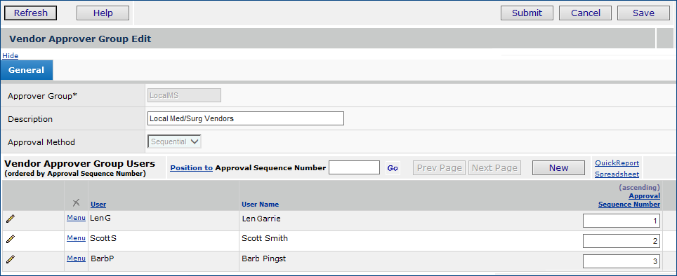 Vendors and Check Name updates are routed first to last, sequentially through an approver group, based on the sequence number associated with each group member.