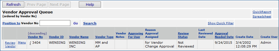 An all-approver queue of vendors awaiting approval is also available. This queue is useful for managers or others who have higher-level authority for all ERP application functions. (See Security for the role object setting.)