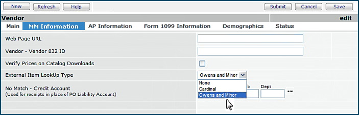 - For Owens and Minor, edit the Owens and Minor vendor record and select Owens and Minor in the field External Item LookupType (Figure 20).