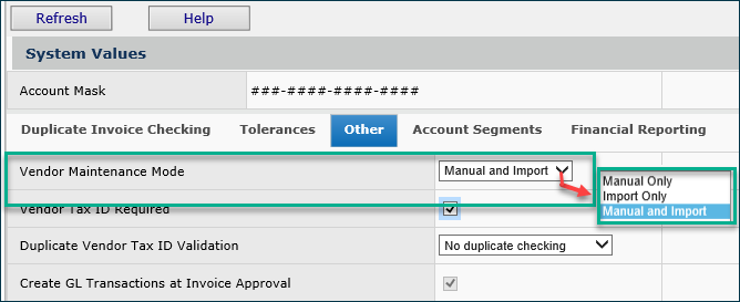 Users want to add vendors to ERP with both the import method, or manually, as they choose. A  feature field Vendor Maintenance Mode is available for this purpose (Figure 1).