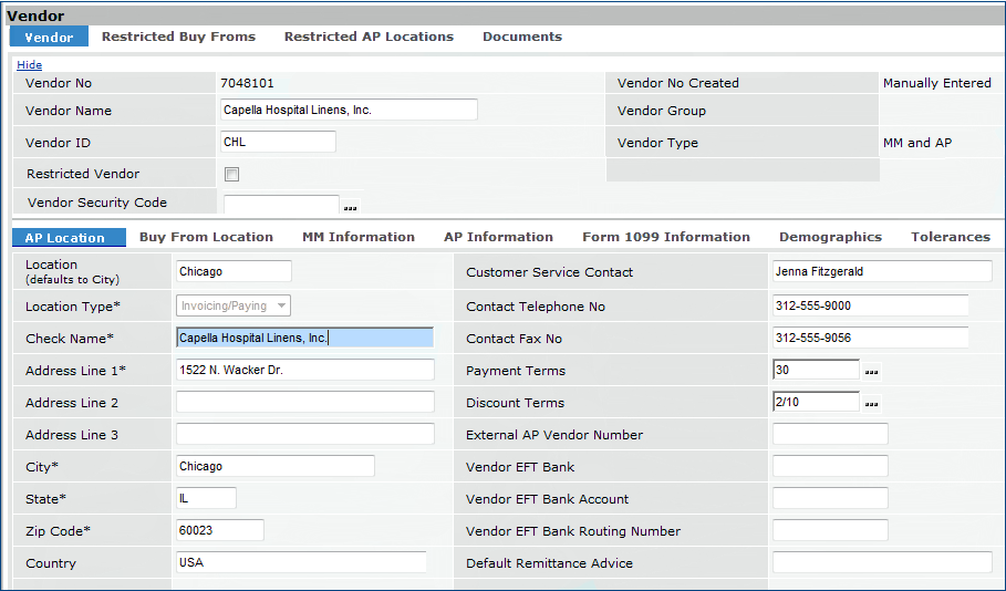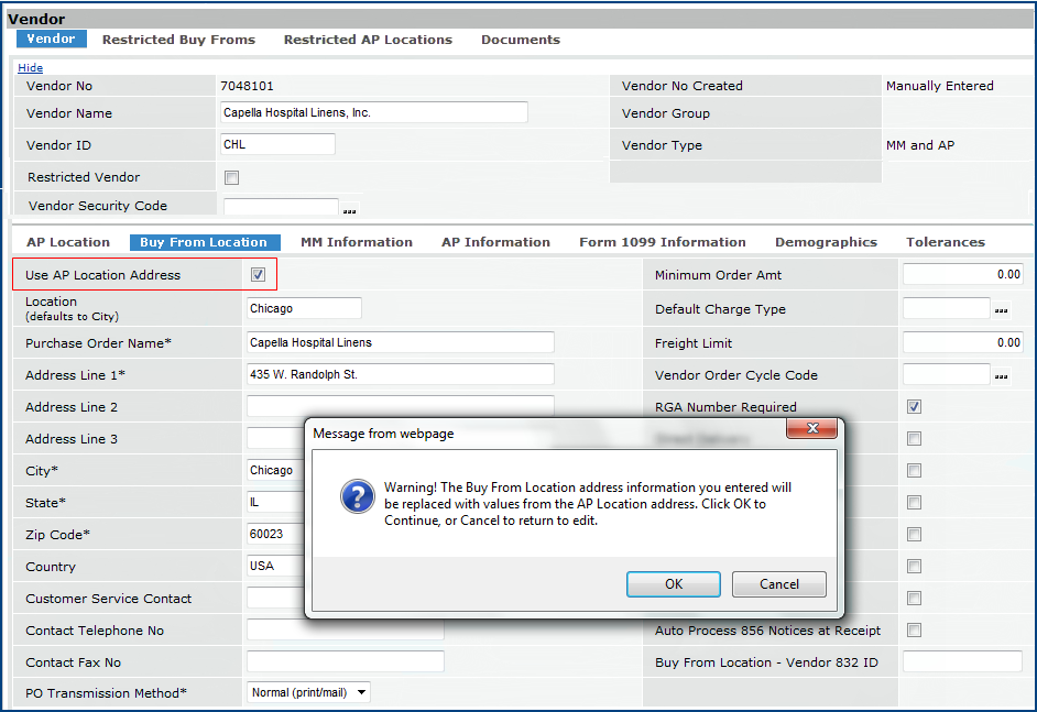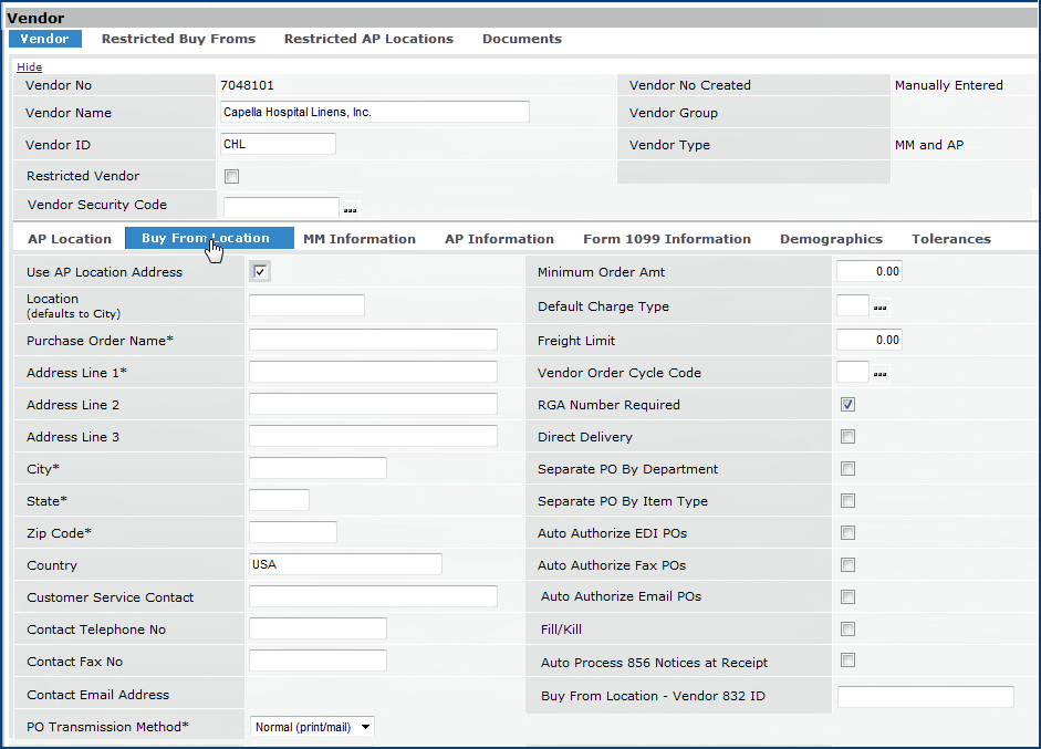 Your site may have established default system values for buy-from location  and AP location records.  A flag on the Vendor Edit panel lets you specify that the defaults are to be used. When the vendor flag is set, the system  populates the AP and/or buy-from location record  with the defaults when a record is created, edited, or copied. The user cannot change the default values  unless the system defaults are removed.