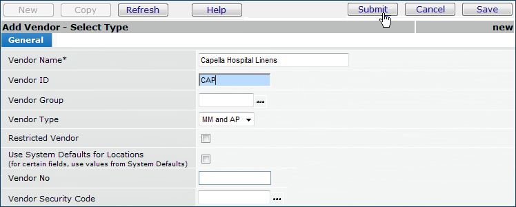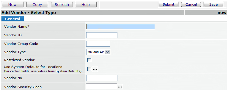 Note: A system setting, described below, lets you decide if you will  enter vendor data manually, import vendor data, or do both. If your site is set up to import vendor data only,