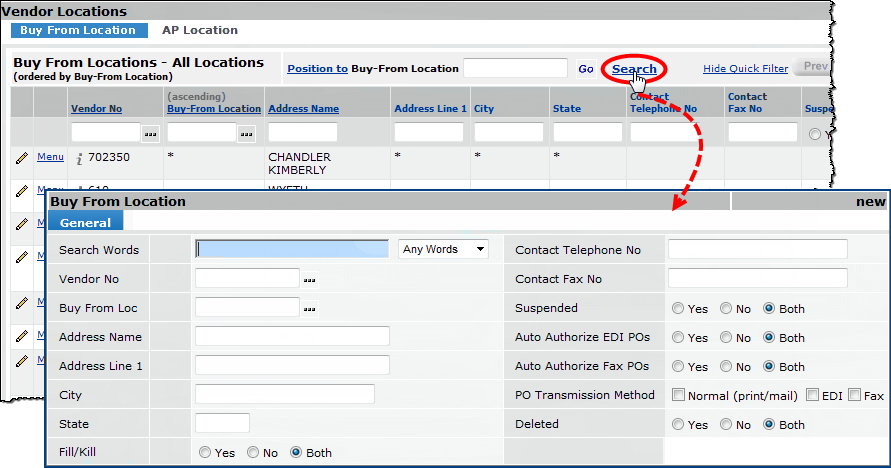 - To view a particular vendor, on the Quick Click menu, enter the Vendor