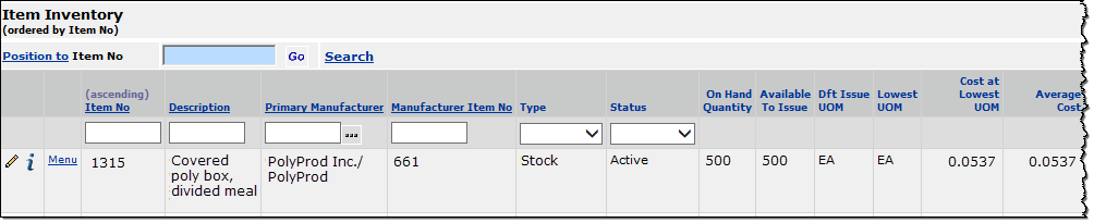 Notice that the needed item — item number 1315 — shows an On Hand Quantity of 500 EA (column 9), and 500 are Available to Issue (column 10). (The Item Inventory list shows other information as well when you scroll to the right.)