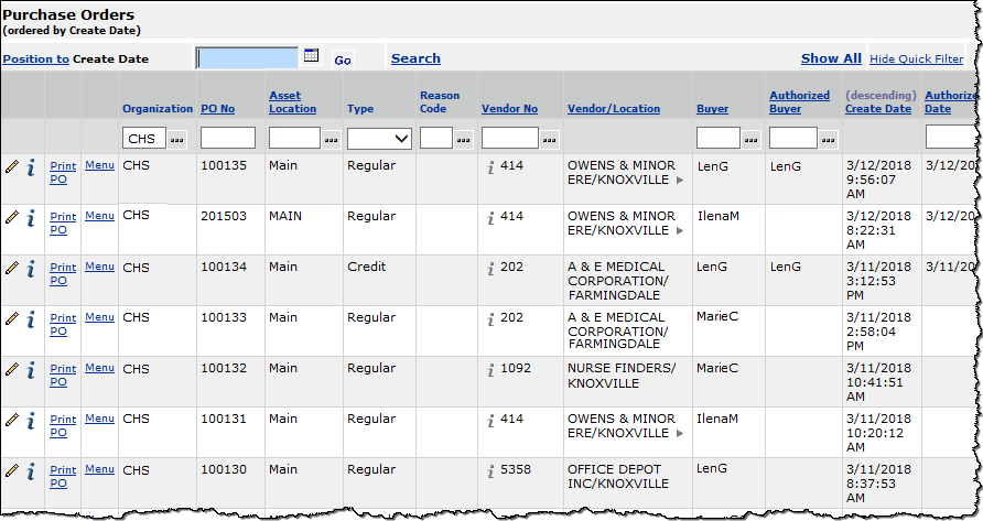 You can use the Quick Filter to display purchase orders for a particular organization, as in the figure below.