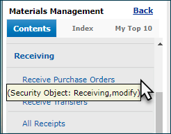 On Chrome or Edge, put the mouse on any Table of Contents element and right click. In Figure 1, for example, to add an item to receive purchase orders, a user must have the Role Object "Receiving" set to Modify in his/her User Profile.